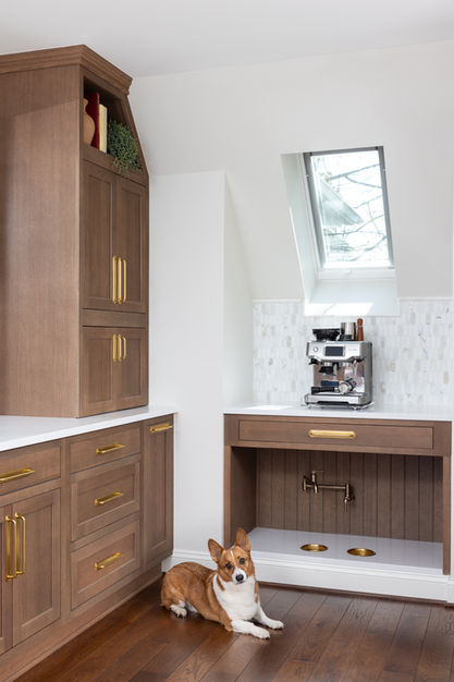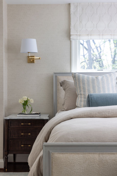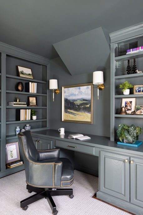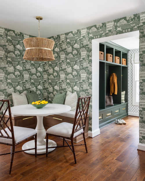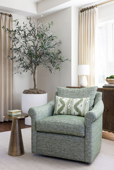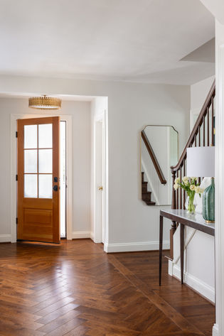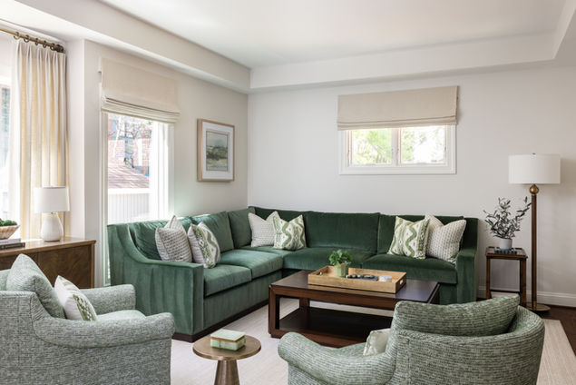 The homeowners wanted to transform a historic 1930s expanded bungalow in Arlington’s Clarendon neighborhood from a series of disjointed, "chopped up" renovations into a cohesive family home by opening up carved-out spaces to create an intuitive, logical flow and direct line of site from the entryway into the family room at the rear of the home. The floor plan was reimagined to accommodate both the high-traffic demands of a young family and the refined requirements of hosting large gatherings of family and friends. Verdant greens in upholstery fabrics, custom window treatments, and whimscal wallpapers tie the main level together, while soft blues and nuetral hues create more private areas for work or relaxation in the office and primary suite.